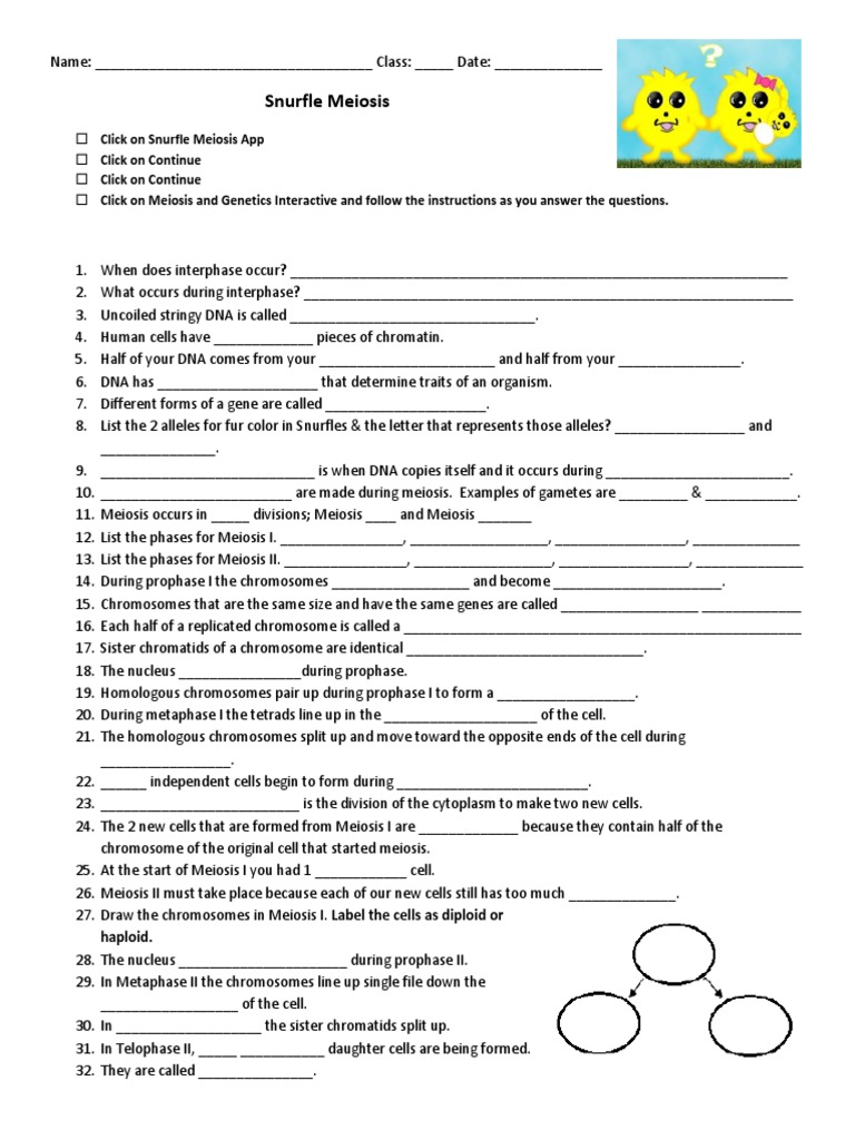 If you dont see any interesting for you use our search form on bottom. 71720 Click on Snurfle Meiosis App Click on Continue Click on Continue Click on Meiosis and Genetics Interactive and follow directions as you answer the following questions. When does interphase occur.